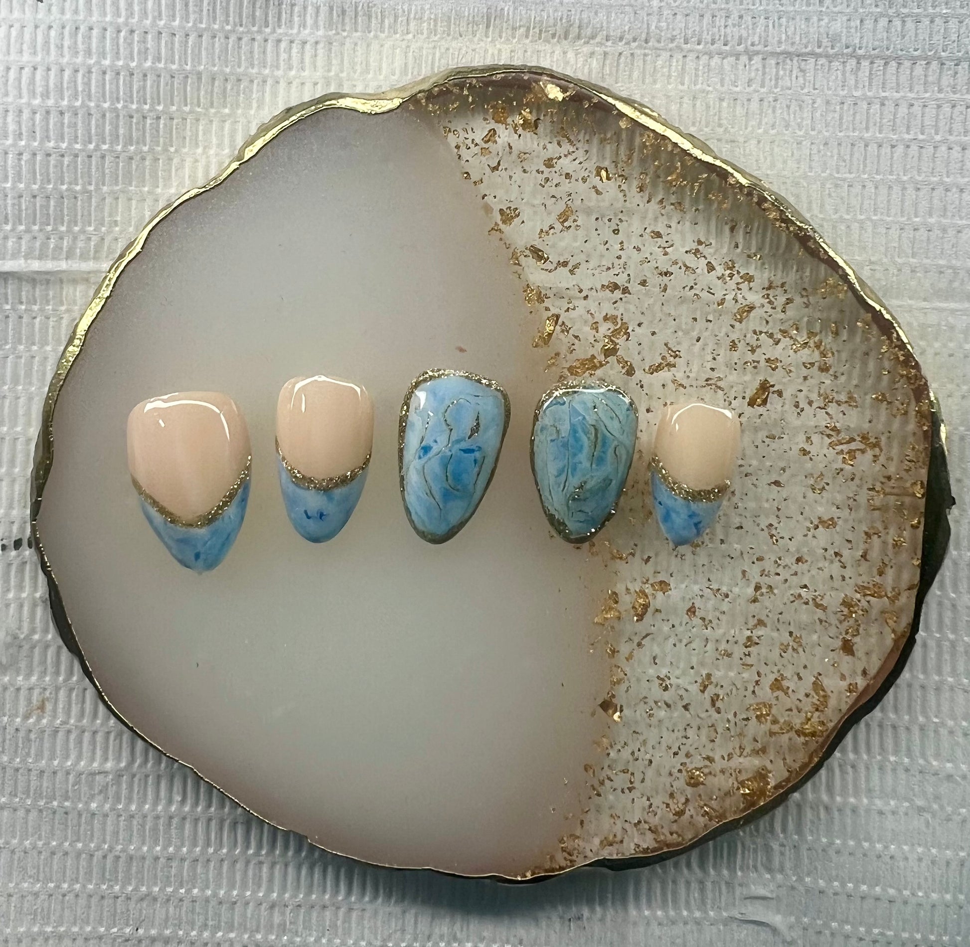 These stunning beach-inspired marble nails feature a mesmerizing blue water marble design, reminiscent of the ocean, and a glimmering golden sand pattern.